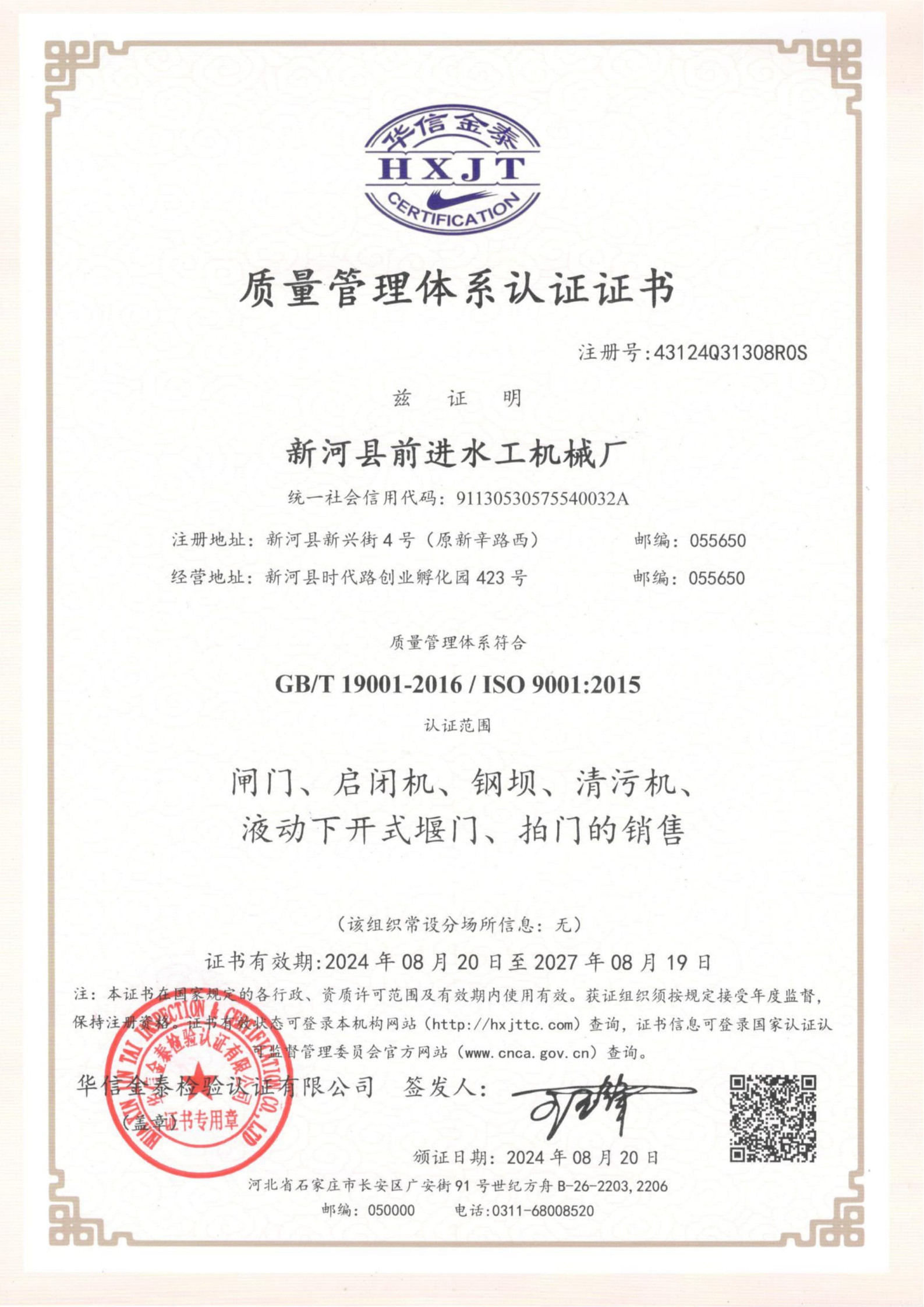 新河縣前進水工機械廠是一家專門從事水利工程設備研發(fā)生產的廠家,現有員工228人,各類高、中級專業(yè)工程技術人員近30人,技術生產工人180多人。公司占地面積14674平方米。公司擁有車、鉗、刨、銑、冷作、鈑金、鑄造等,工種齊全,加工能力和技術力量雄厚,并具備理化測試手段與儀器設備。前進水工專注景觀閘門,鋼壩,合頁壩,液壓升降壩,液壓閘門,臥倒門,一字門,人字門,液壓啟閉機,卷揚啟閉機,螺桿啟閉機,清污機,除污機,閘門,拍門等設備的研發(fā)與生產,是新河水利工程產品行業(yè)的領跑者,不僅在同行業(yè)群中揭起了一次又一次的技術革新,更為水利工程企業(yè)提供了更高更大的選擇平臺。